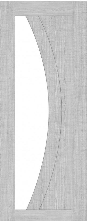 The stunning asymmetry of this design and the distinctive rippling of light grey ash veneer put this gorgeous door among the most sought-after styles in the modern home. A pane of curved, clear, toughened glass, provides light and a sense of space.