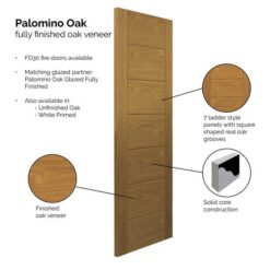 The JB Kind Pre-Finished Oak Palomino Door features a distinctive modern design crafted from real oak, showcasing striking grain detail and clean lines. Supplied pre-finished for durability and ease of installation, it brings natural warmth and contemporary style to any interior setting.
