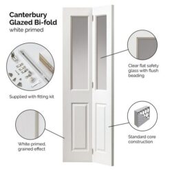 The JB Kind White Moulded Canterbury Clear Glazed Bi-Fold Door offers a classic design with a bright, space-saving solution. Finished in crisp white with traditional moulded detailing, it features clear glazed panels that maximise natural light between rooms. Designed to fold neatly away, this door is ideal for creating flexible, open interiors while maintaining a timeless style.