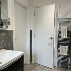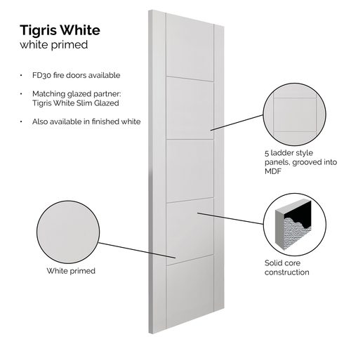 The JB Kind White Primed Tigris Fire Door combines contemporary design with essential fire protection. Featuring the same elegant vertical grooved Tigris pattern, it delivers a modern aesthetic while helping to enhance safety within the home. Supplied in a smooth white primed finish, it is ready for painting to suit your interior scheme.