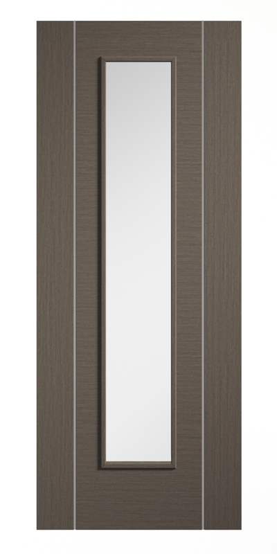 Featuring 1 long vertical clear glazed panel, the Alcaraz Chocolate Grey internal door features aluminium inlay decorative bars, either side of the glazed panel and rasied mouldings on both sides. This modern internal door will make a statement in your home.