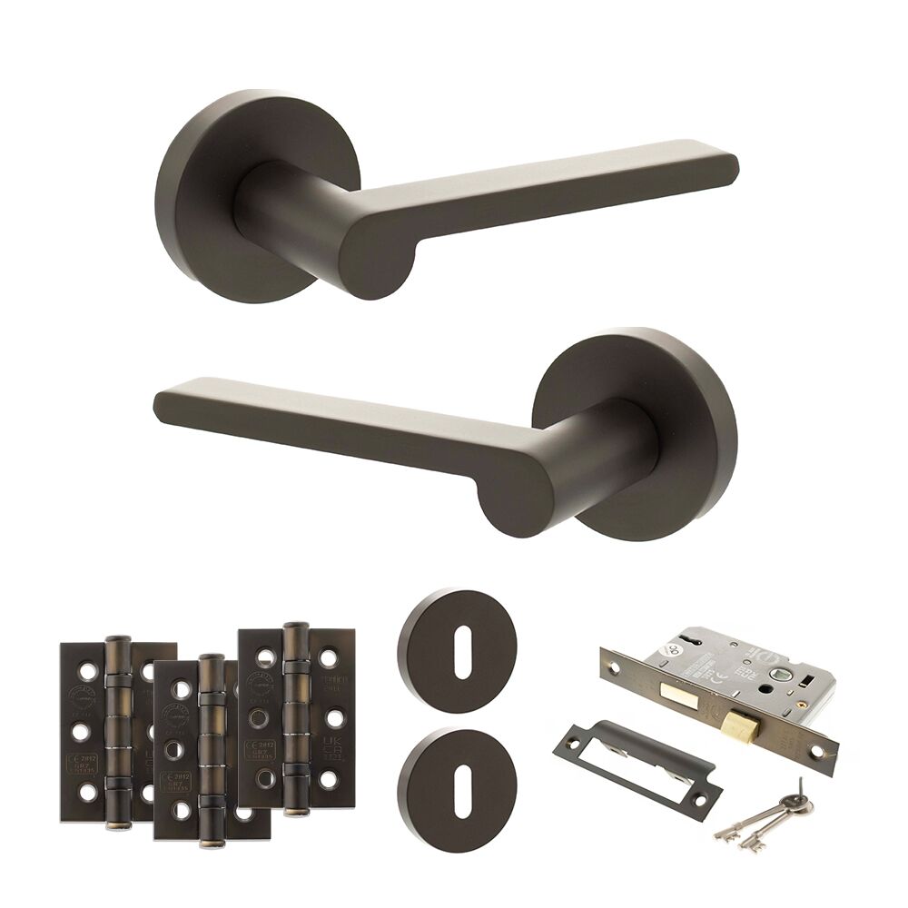 Senza Pari Darrio Door Handle Pack (3 Lever Lock Set – 3″ CE Sashlock, 3″ Fire Rated Hinges x3) – Urban Dark Bronze