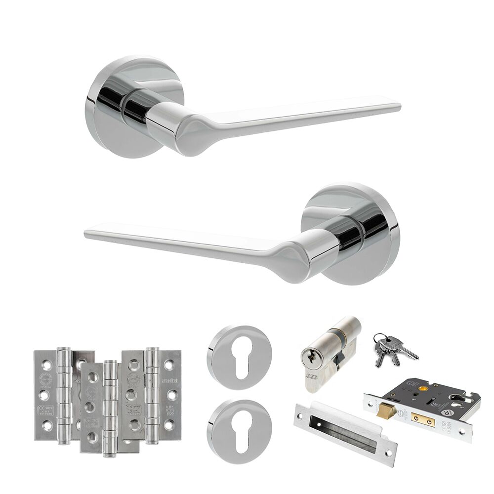 Senza Pari Laviano Door Handle Pack (Euro Lock Set – 3″ CE Sashlock, 3″ Fire Rated Hinges x3) – Polished Chrome