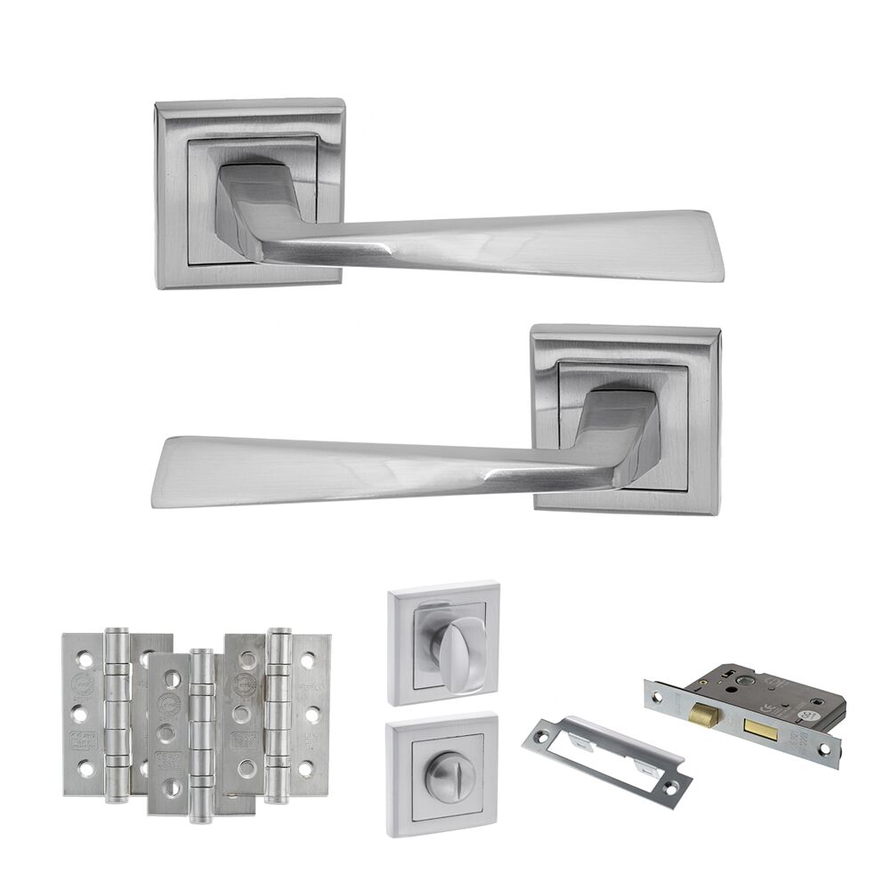STATUS California Door Handle Pack (Bathroom Set – 3″ CE Bathroom Lock, 3″ Fire Rated Hinges x3) – Satin Chrome