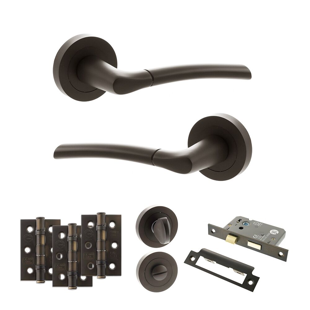 STATUS Indiana Door Handle Pack (Bathroom Set – 3″ CE Bathroom Lock, 3″ Fire Rated Hinges x3) – Urban Dark Bronze