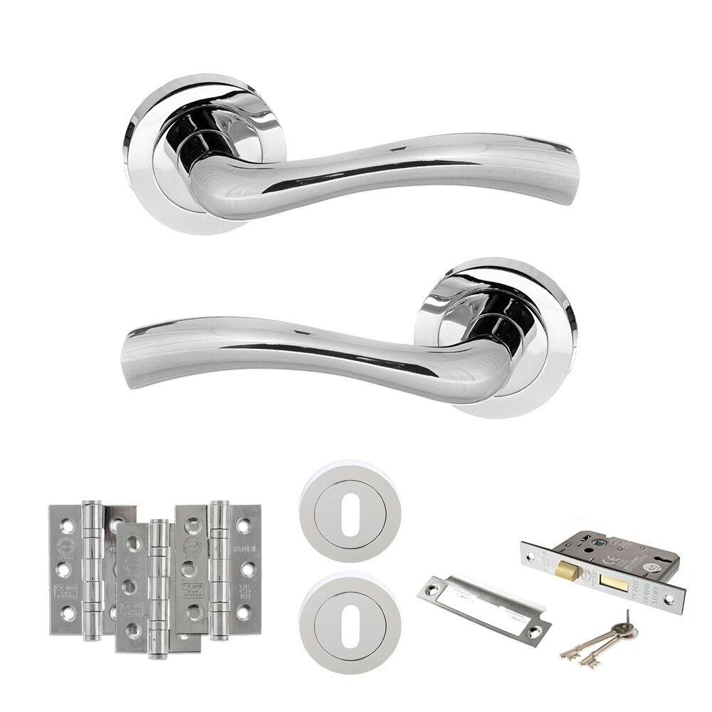 STATUS Texas Door Handle Pack (3 Lever Lock Set – 3″ CE Sashlock, 3″ Fire Rated Hinges x3) – Polished Chrome
